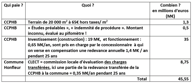 Coût total pour la CCPHB et la commune de Honfleur = 45,55 M€ : 1,8 M€ en 2024-2026 et 43,75M€ ensuite sur 25 ans. Les subventions ? C’est en cours, on cherche, « 5 M€ possible », mais on fonce tout de suite.